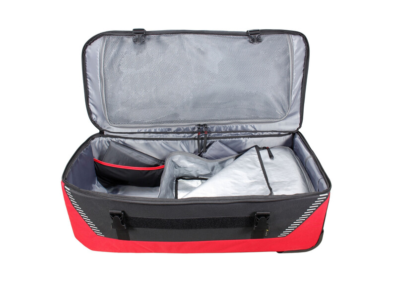 - Hauptfach, gepolstert mit ca. 85 Liter Volumen, entnehmbares, wasserdichtes Stiefelfach mit Reißverschluss (B x H x T: ca. 50 x 15 x 37 cm, Volumen: ca. 27 L, für Stiefel bis Größe 50), 2 Netzfächer (B x H: je ca. 42 x 17 cm), 2 große Falttaschen mit Kordelzug (1x grau, 1x schwarz, je ca. 50 L), Reißverschluss mit Ösen für z.B. Plombierung