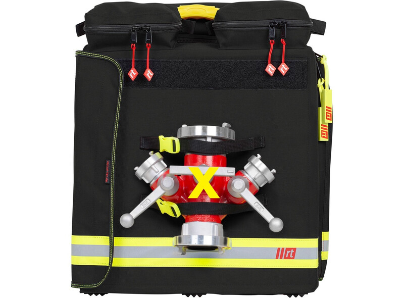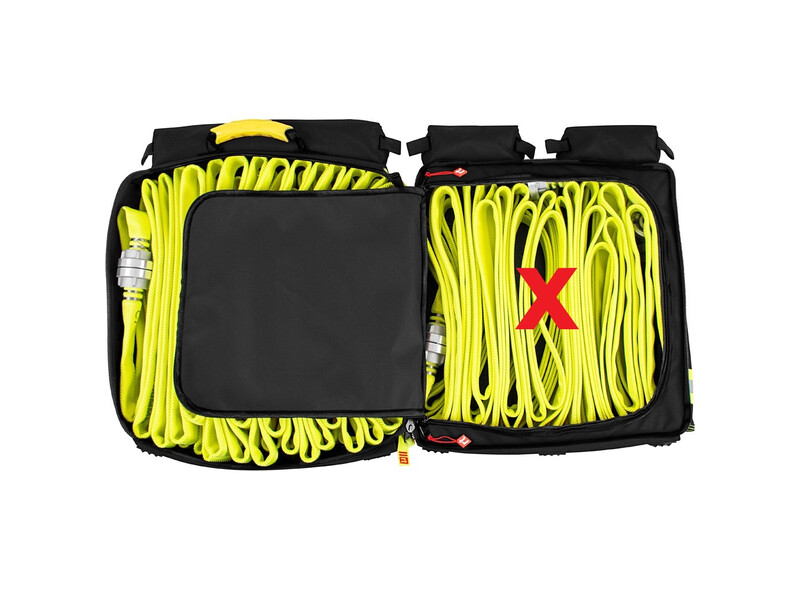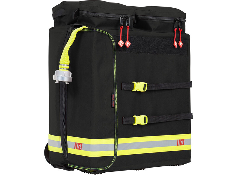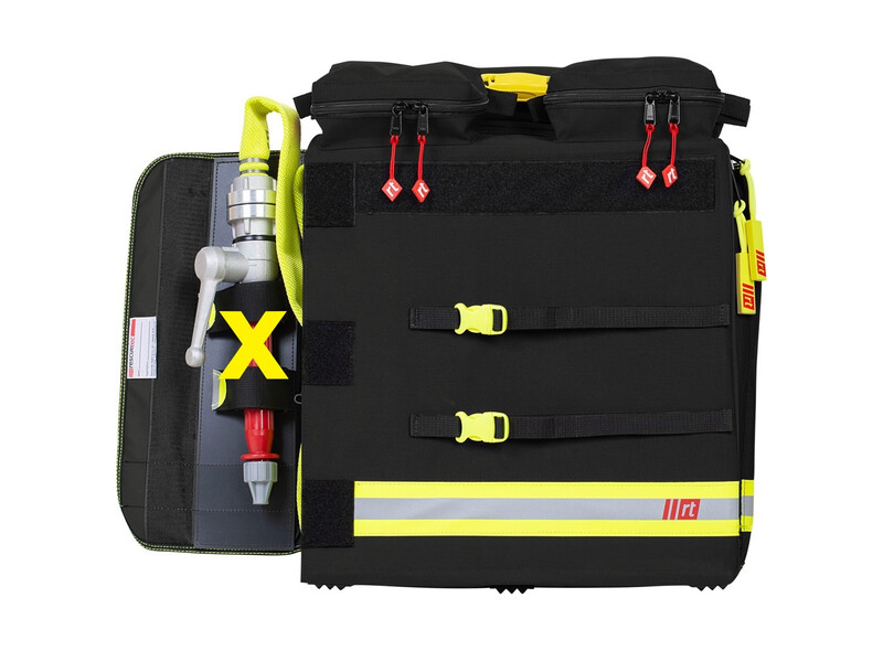 Die beiden großen Innenfächer bieten Raum für je 2 x 15 m D-Schlauch (gesamt 60 m) in Buchten gelegt oder bis zu je 2 x 30 m gerollt (gesamt 120 m!). In den rechts und links zu öffnenden Deckeln ist jeweils eine Befestigung für das Hohlstrahlrohr vorgesehen. Die drei Außentaschen bieten ausreichend Platz für Schutzbrillen und Halbmasken. An der Vorderseite des Rucksacks kann ein Verteiler C-DCD oder C-DD befestigt werden.