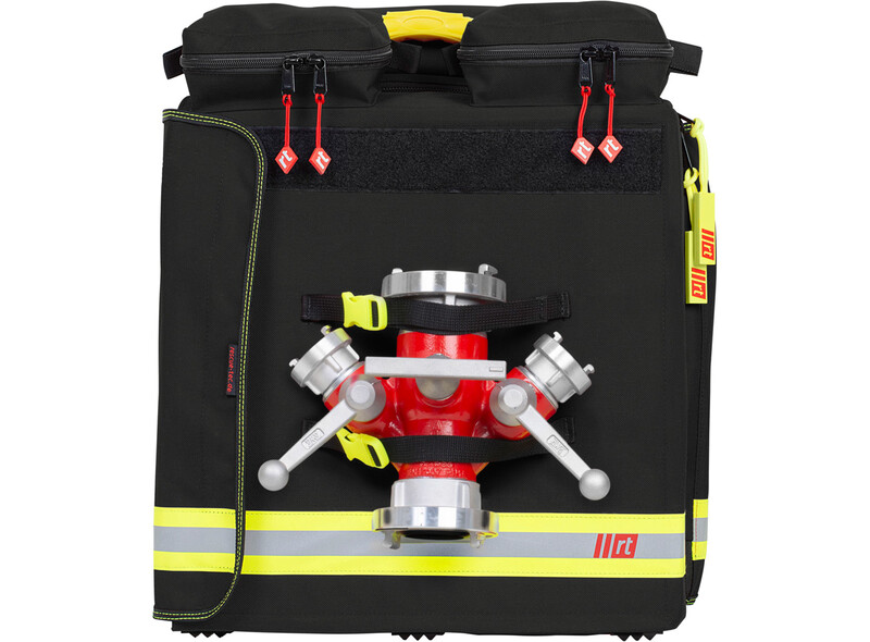 Die beiden großen Innenfächer bieten Raum für je 2 x 15 m D-Schlauch (gesamt 60 m) in Buchten gelegt oder bis zu je 2 x 30 m gerollt (gesamt 120 m!). In den rechts und links zu öffnenden Deckeln ist jeweils eine Befestigung für das Hohlstrahlrohr vorgesehen. Die drei Außentaschen bieten ausreichend Platz für Schutzbrillen und Halbmasken. An der Vorderseite des Rucksacks kann ein Verteiler C-DCD oder C-DD befestigt werden.